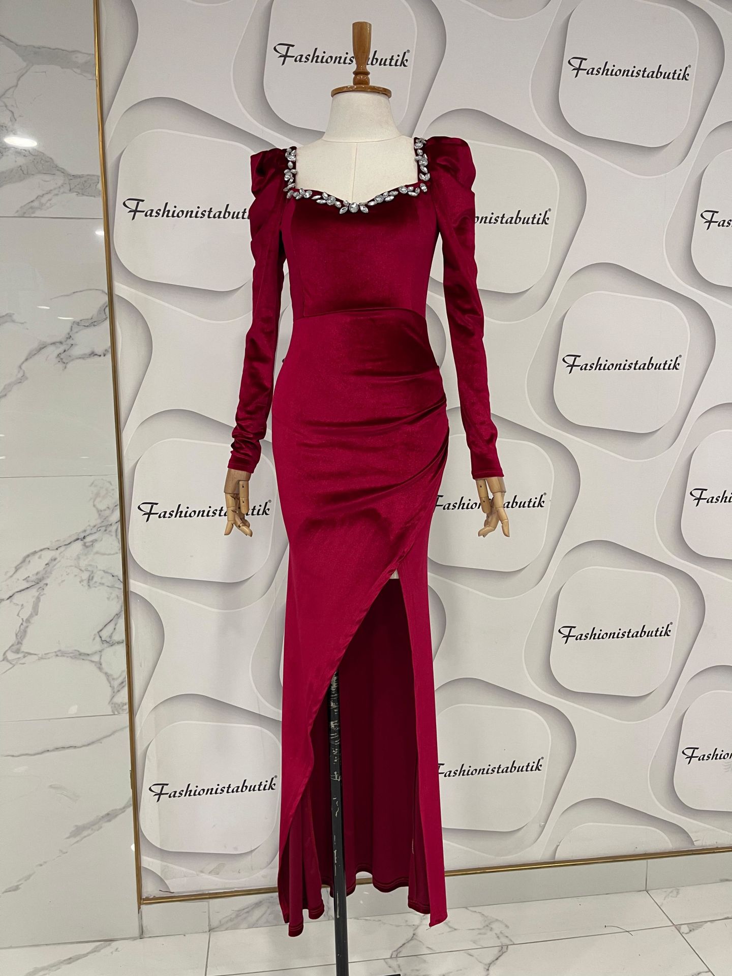 Detaylar: Taş işlemeli kalp yaka, asimetrik yırtmaç tasarım