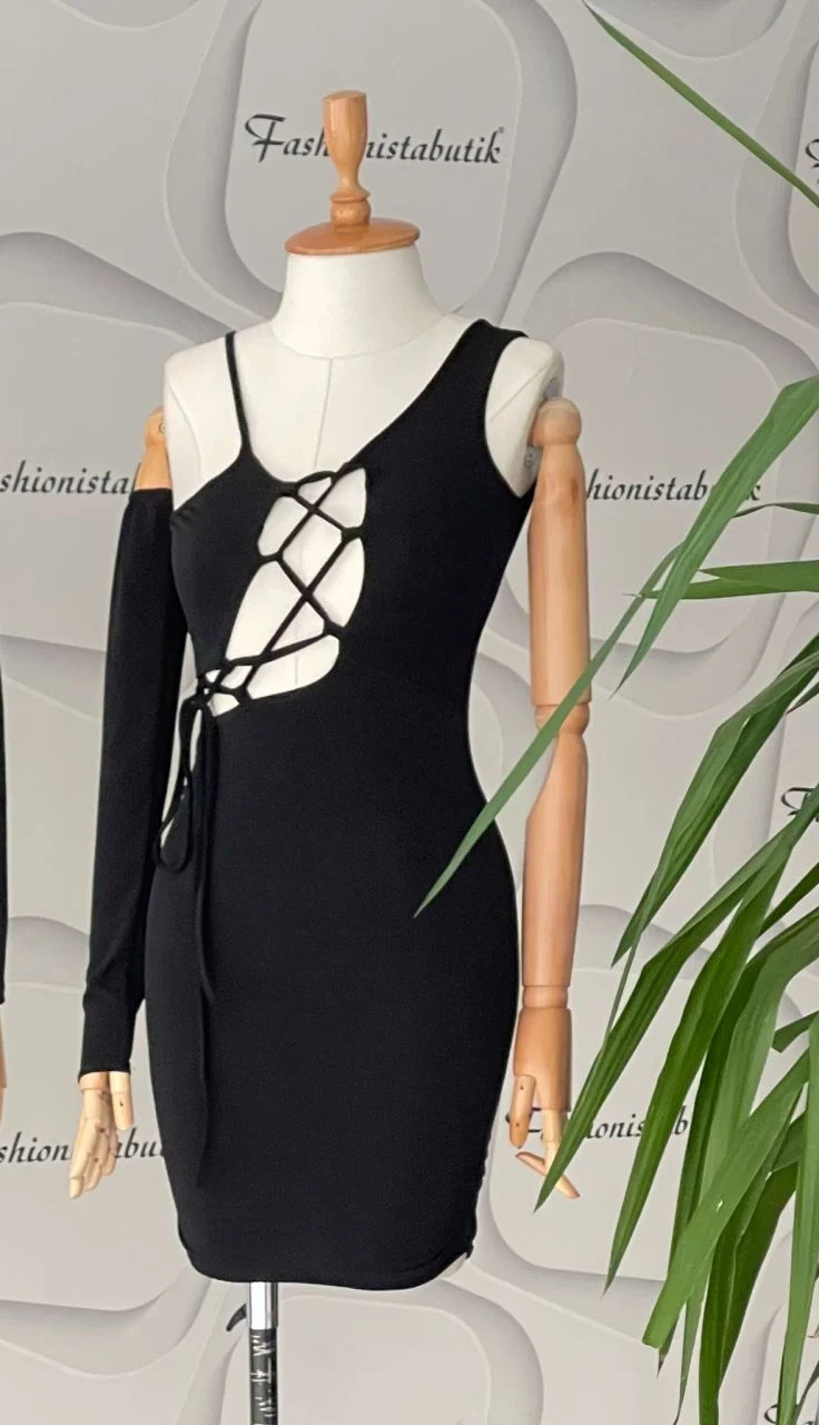 Adeline siyah mini elbise, asimetrik kesimi ve iddialı detaylarıyla göz kamaştırıyor. Tek omuz uzun kollu yapısı, diğer omzundaki ince askı detayıyla modern ve sofistike bir görünüm sunar. Ön kısmındaki derin V yaka kesimi, çapraz ip bağlama detaylarıyla vurgulanarak cesur ama zarif bir stil yaratır.