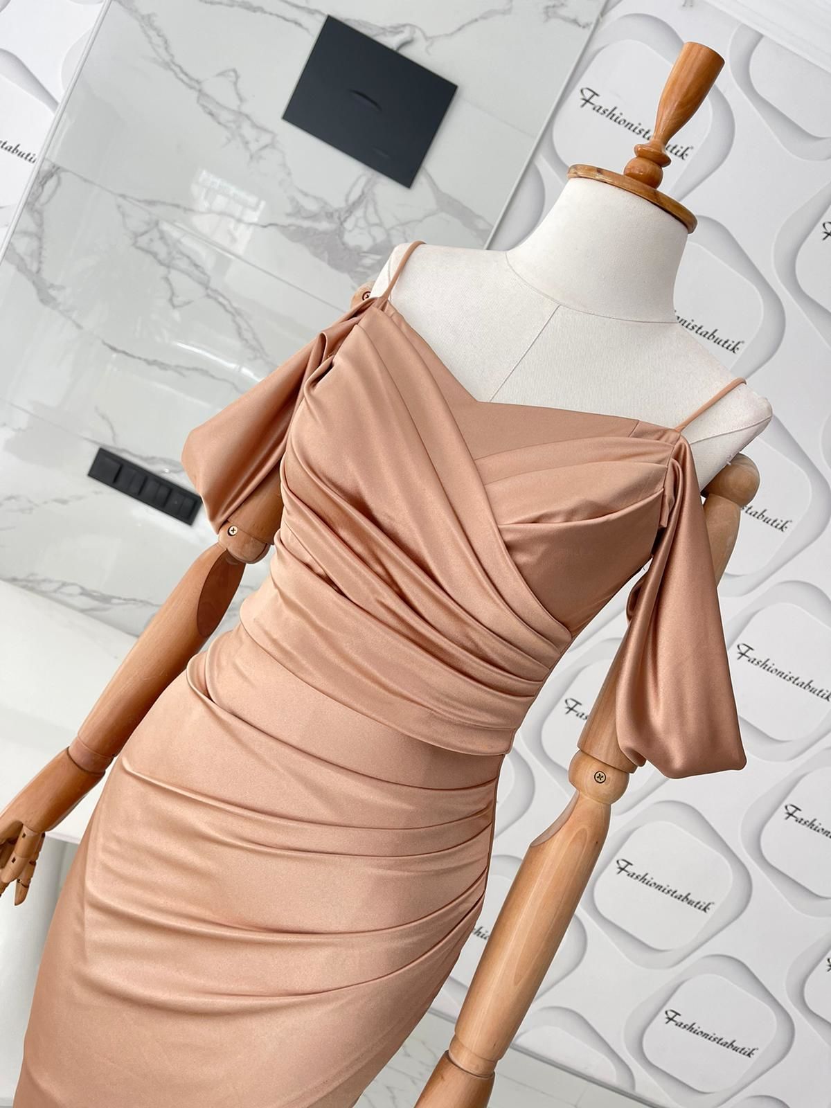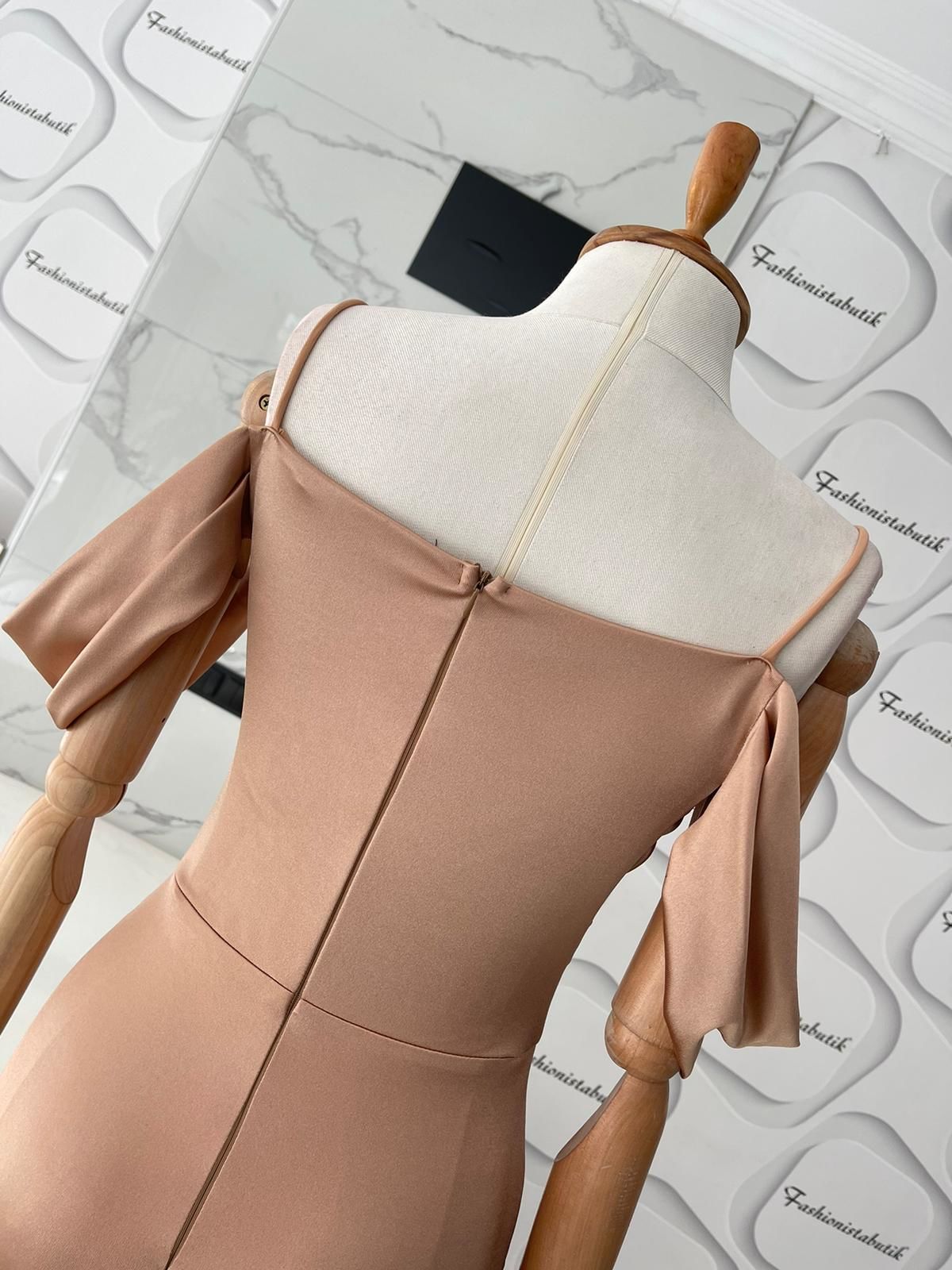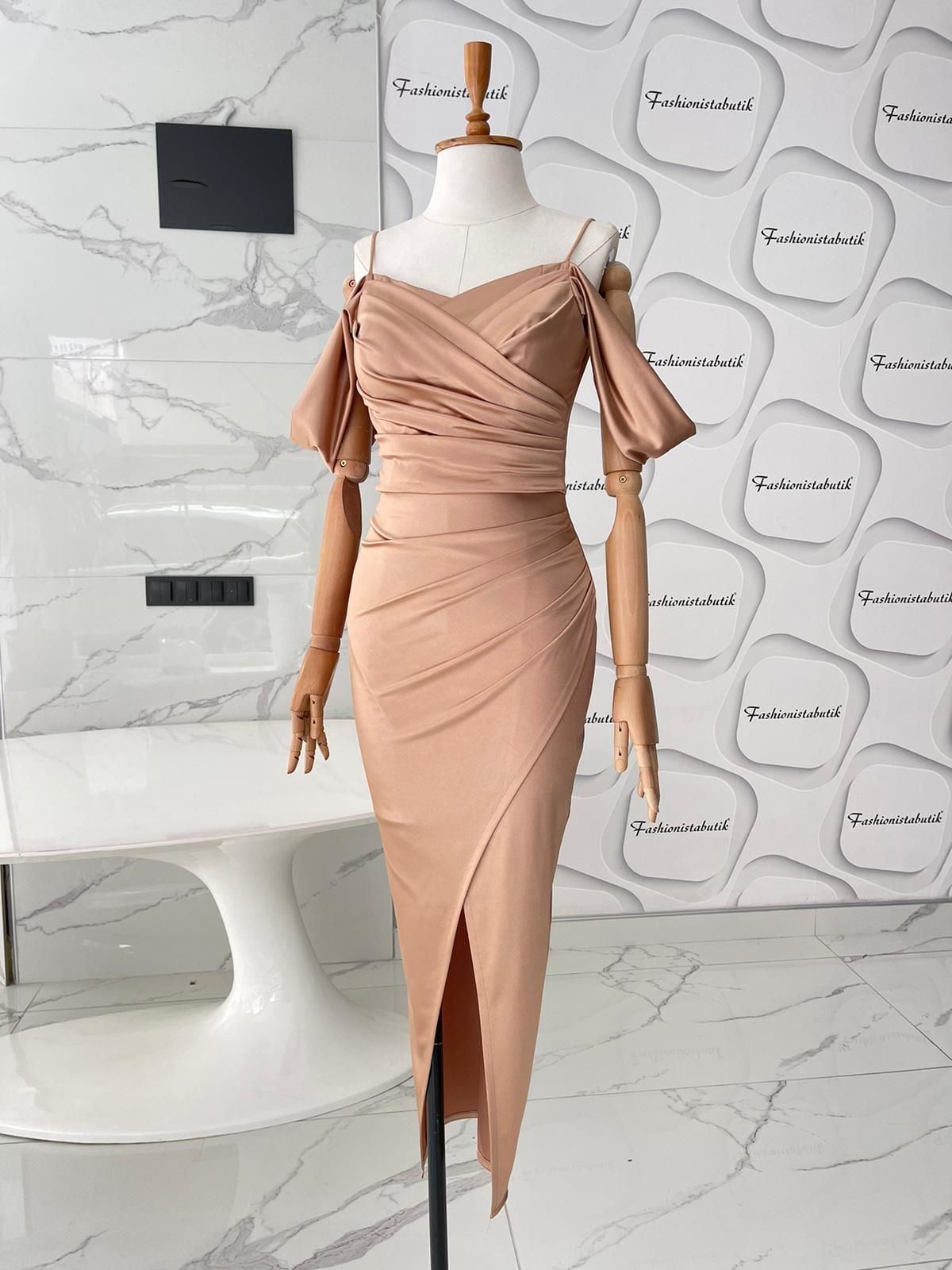 “Drapeli Saten Elbise – Bej” için yorum yapan ilk kişi siz olun