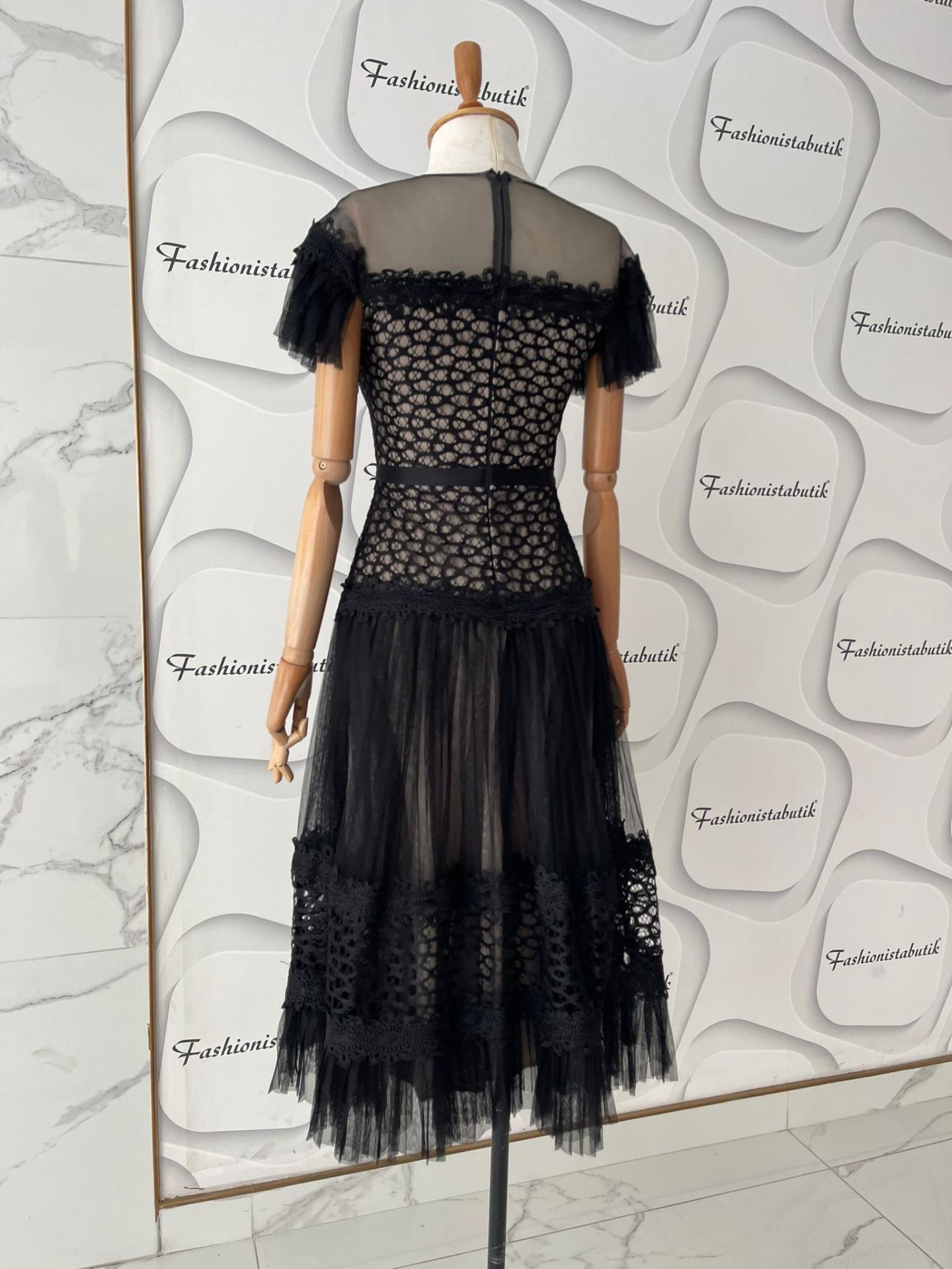 Piliseli tül ve işlemeli etek tasarımıyla asil bir duruş sergilerken, ten rengi astarı ile konfor ve şıklığı bir arada sunar.
