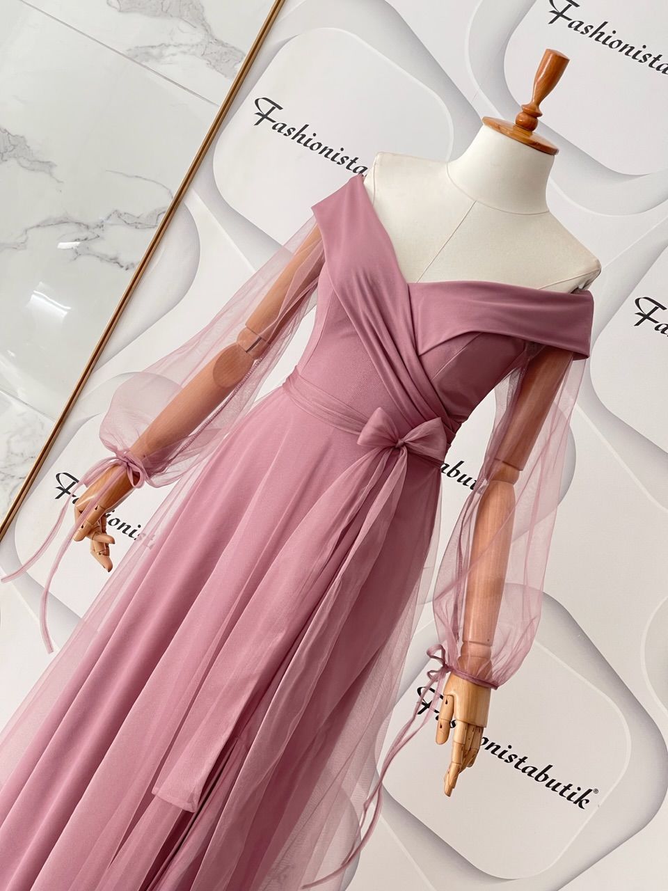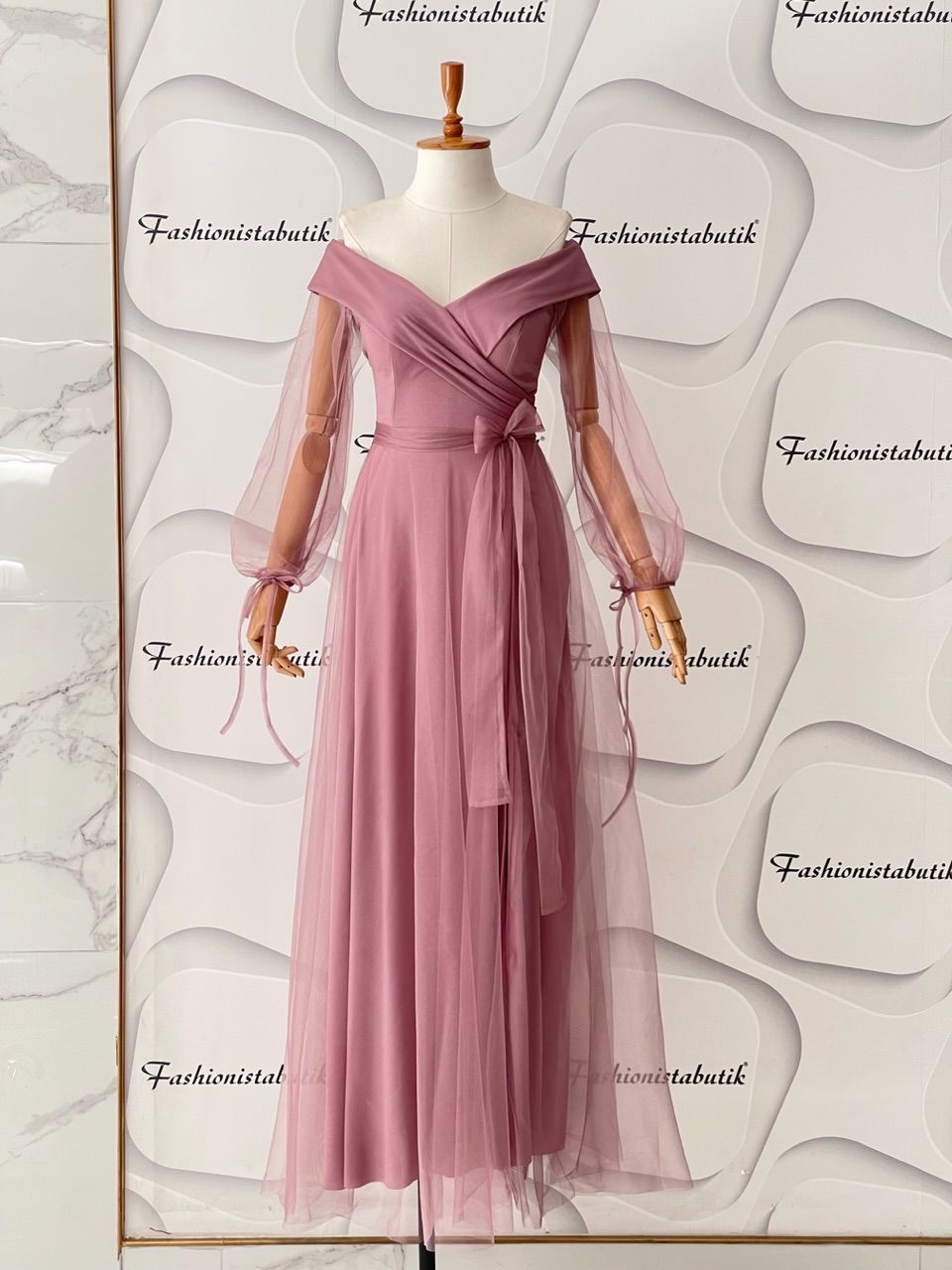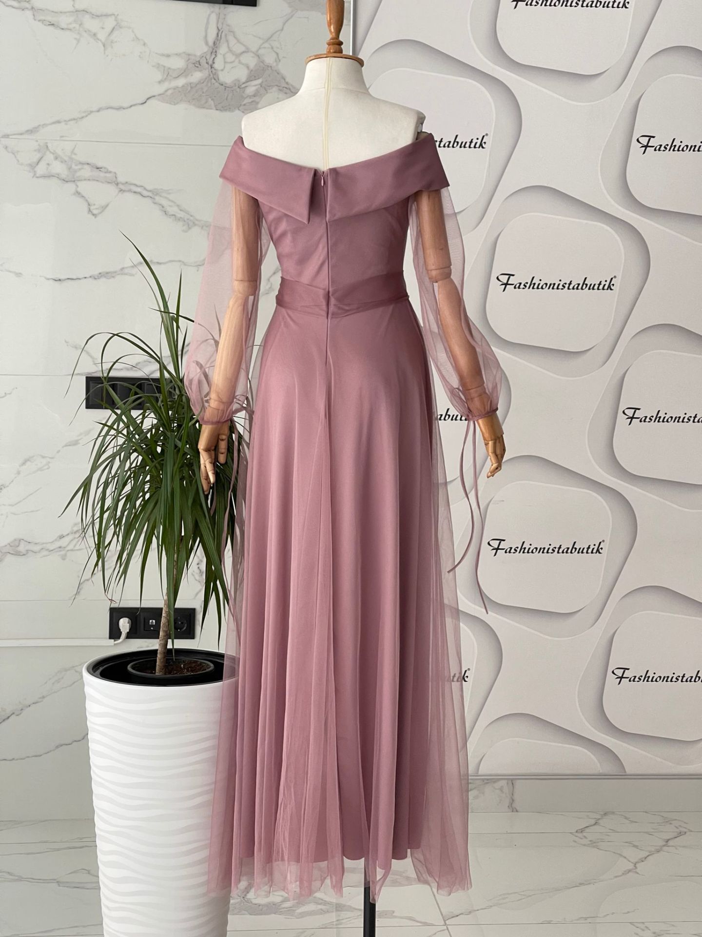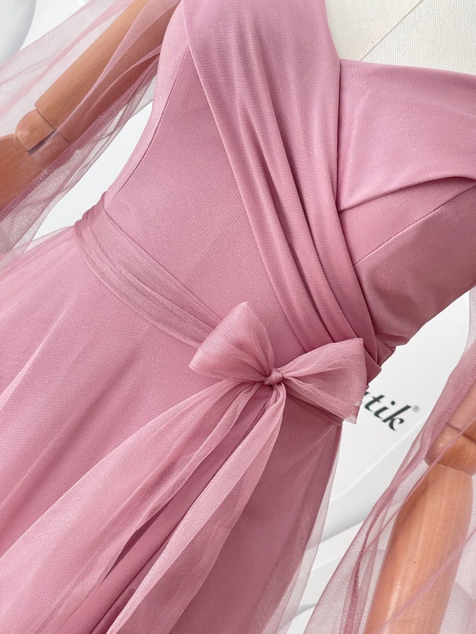 Zarif ve romantik bir şıklık sunan Madonna Yaka Abiye, özel günler, nişanlar, düğünler ve davetlerde göz kamaştırıcı bir stil oluşturur. Gül kurusunun yumuşak ve şık tonu, astralı tül kumaşın hafifliğiyle birleşerek modern ve etkileyici bir görünüm kazandırır.