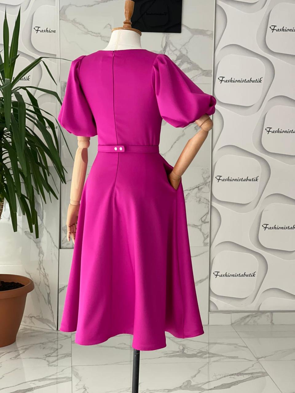 Midi Kloş Elbise, feminen ve asil bir görünüm sunar. Kristal taş kemeri ve tarlatanlı etek uçlarıyla hareketli bir siluete sahiptir.