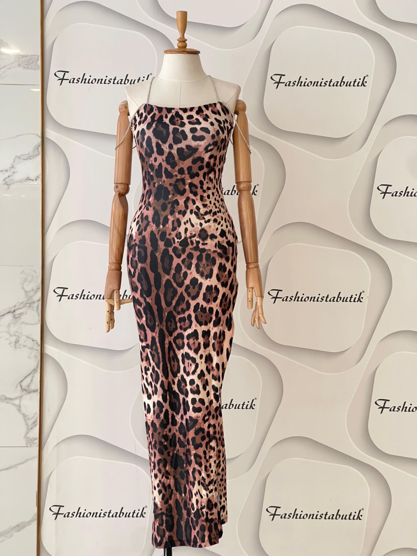 Detaylar: Taş askı, leopar desen, zarif ve iddialı tasarım